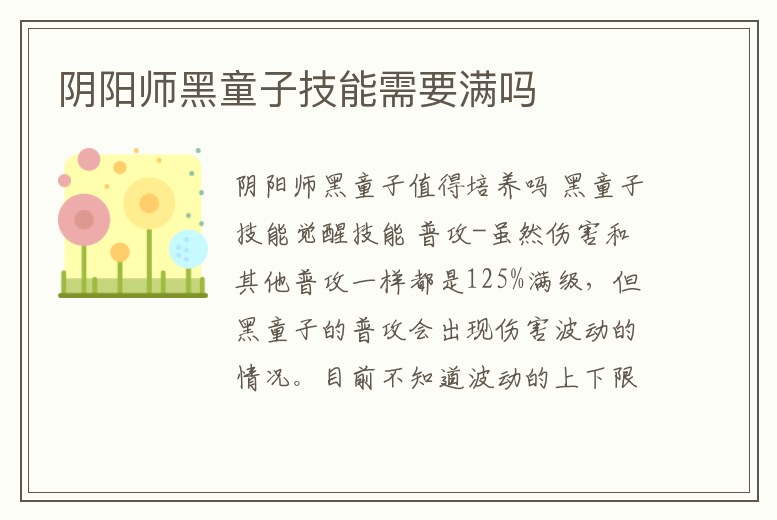 技能 普攻-雖然傷害和其他普攻一樣都是125%滿級,但黑童子的普攻會出現傷害波動的情況。目前不知道波動的上下限是多少,但預期值應該都是125%這樣沒錯。被動-黑童子被攻擊時有12%(滿級20%)的概率觸發自己的3火。