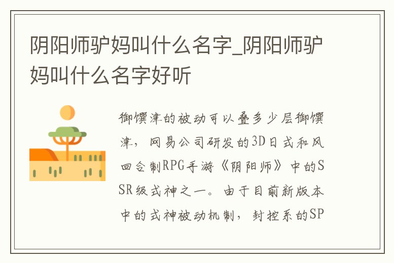 御饌津,網易公司研發的3D日式和風回合制RPG手游《陰陽師》中的SSR級式神之一。由于目前新版本中的式神被動機制,封控系的SP驢媽卻成為了短板。