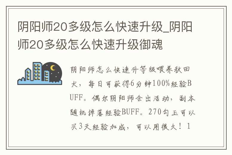 - 陰陽(yáng)師20多級(jí)怎么快速升級(jí)_陰陽(yáng)師20多級(jí)怎么快速升級(jí)御魂