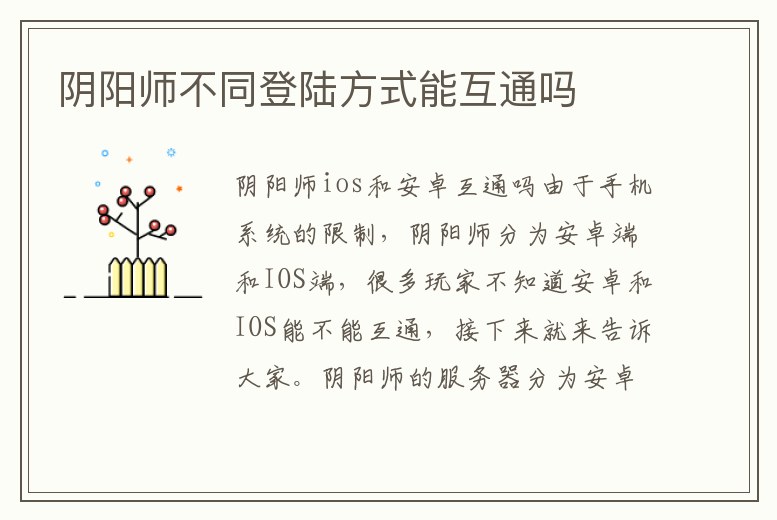 《陰陽師》安卓和ios互通。《陰陽師》是由中國網易移動游戲公司自主研發的3D日式和風回合制RPG手游。2016年6月1日11:00,《陰陽師》開放安卓首測;同年9月2日,登陸ios平臺于App Store首發;同年9月9日,陰陽師全平臺。