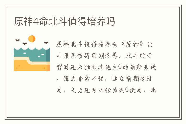 《原神》北斗角色值得前期培養。北斗對于暫時還未抽到其他主C的萌新來說,強度非常不錯,適合前期過渡用,之后還可以轉為副C使用,北斗完全可以培養但是不用拉得太高,夠用就可以了,等之后抽到其他主C之后就可以換掉了。北。