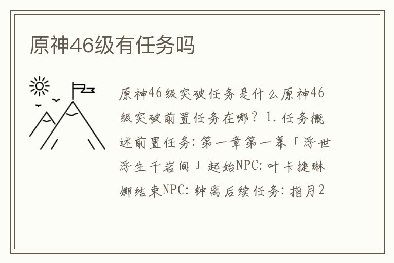 原神46級突破前置任務在哪 ?1. 任務概述 前置任務:第一章 第一幕「浮世浮生千巖間」 起始NPC:葉卡捷琳娜 結(jié)束NPC:鐘離 后續(xù)任務:指月 2. 任務過程 1.等待到第二天。2.與銀行 。
