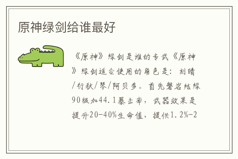 《原神》綠劍適合使用的角色是:刻晴/行秋/琴/阿貝多。首先磐巖結綠90級加44.1暴擊率,武器效果是提升20-40%生命值,提供1.2%-2.4%最大生命值的攻擊力加成。很明顯,單手劍主C/副C都適合帶這把武器。《原神》游戲。