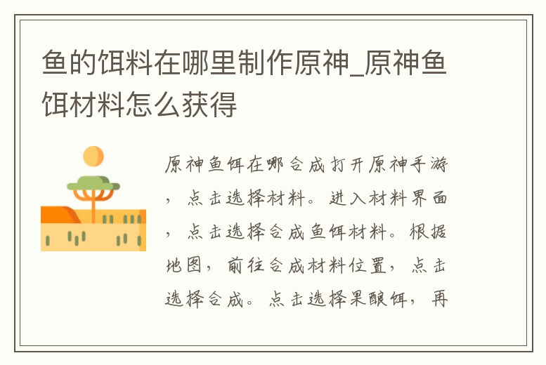 打開原神手游,點擊選擇材料。進入材料界面,點擊選擇合成魚餌材料。根據地圖,前往合成材料位置,點擊選擇合成。點擊選擇果釀餌,再點擊合成,即可合成魚餌。原神魚餌配方如下:螢草餌:吸引魚類:所有魚類。合。