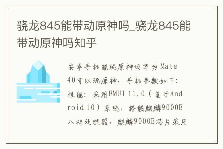 題主是否想詢問“麒麟845帶得動原神嗎”?能帶動。原神手機配置的要求有安卓移動設備:處理器為驍龍84麒麟980及以上,正好達到標準,是可以帶動原神游戲的。