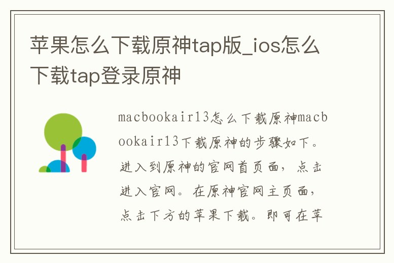 macbookair13下載原神的步驟如下。進入到原神的官網首頁面,點擊進入官網。在原神官網主頁面,點擊下方的蘋果下載。即可在蘋果下載頁面中,下載到原神。