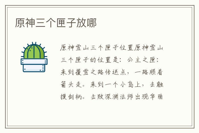 原神雪山三個(gè)匣子位置原神雪山三個(gè)匣子的位置是:公主之匣:來到覆雪之路傳送點(diǎn),一路順著箭頭走。來到一個(gè)小島上,去觸摸劍柄。擊敗深淵法師出現(xiàn)華麗寶箱,里面就是公主之匣。祭祀之匣:來到圖中紅框處,有三個(gè)風(fēng)種子,開啟風(fēng)場(chǎng)網(wǎng)上飛。1、原神三個(gè)匣子密室位置第一個(gè)匣子位置在覆雪之路附近。第二個(gè)匣子在星熒洞穴上面一點(diǎn)。第三個(gè)匣子地圖位置