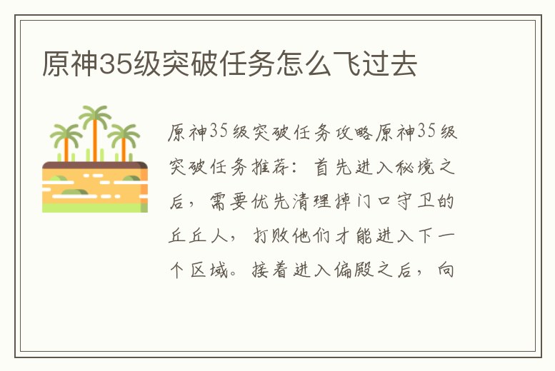 原神35級(jí)突破任務(wù)推薦:首先進(jìn)入秘境之后,需要優(yōu)先清理掉門口守衛(wèi)的丘丘人,打敗他們才能進(jìn)入下一個(gè)區(qū)域。接著進(jìn)入偏殿之后,向左走,擊敗沿途的敵人和內(nèi)殿里的敵人。接著利用飛行進(jìn)入雷室的核心邊緣,清理掉守衛(wèi)在。