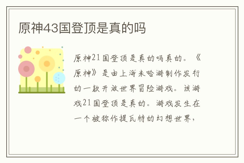 原神21國登頂是真的嗎真的。《原神》是由上海米哈游制作發行的一款開放世界冒險游戲。該游戲21國登頂是真的。游戲發生在一個被稱作提瓦特的幻想世界,在這里,被神選中的人將被授予神之眼,導引元素之力。玩家將扮演一位名為旅行者的神秘角色,在。2、《原神》27國登頂是什么意思米哈游《原神》這款游戲截止2021年4月