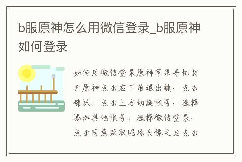 打開原神點擊右下角退出鍵,點擊確認。點擊上方切換帳號,選擇添加其他帳號。選擇微信登錄,點擊同意獲取昵稱頭像之后點擊進入即可。原神登錄方式有兩種,一種是手機驗證碼登錄,一種是賬號密碼登錄,國內有兩個服務器 原神登錄方。
