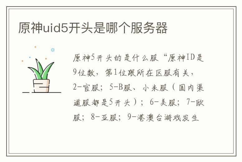 《原神》uid開頭代表玩家所屬的服務器。其中uid2開頭是官服;uid5開頭是B服、小米服等,國內渠道服也是5開頭;uid6開頭是美服;uid7開頭是歐服;uid8開頭是亞服;uid9開頭是港澳服。