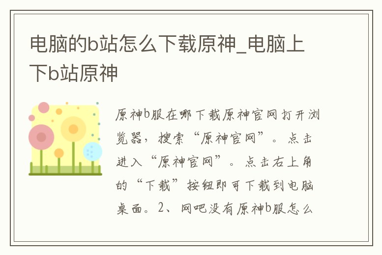 可以在瀏覽器上搜b站,在b站上下載安裝即可游玩。原神b服就是嗶哩嗶哩服,玩家只能通過b站這個特殊渠道才能下載b服。在電腦上通過瀏覽器搜索b站,然后進入b站官網搜索原神,然后進行安裝并打開。即可在電腦上玩原神b服。