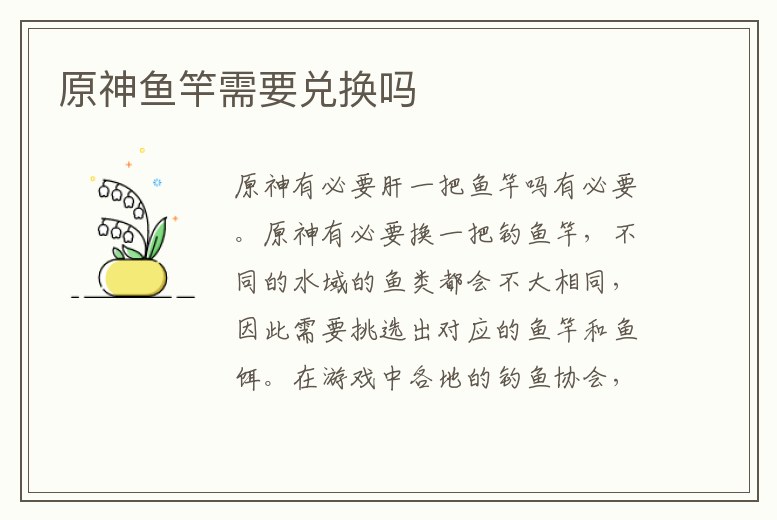 有必要。原神有必要換一把釣魚竿,不同的水域的魚類都會不大相同,因此需要挑選出對應(yīng)的魚竿和魚餌。在游戲中各地的釣魚協(xié)會,使用釣獲的魚類可以兌換魚竿。目前魚竿有3類:普通魚竿。各國專屬魚竿(僅加速地區(qū)魚池)。