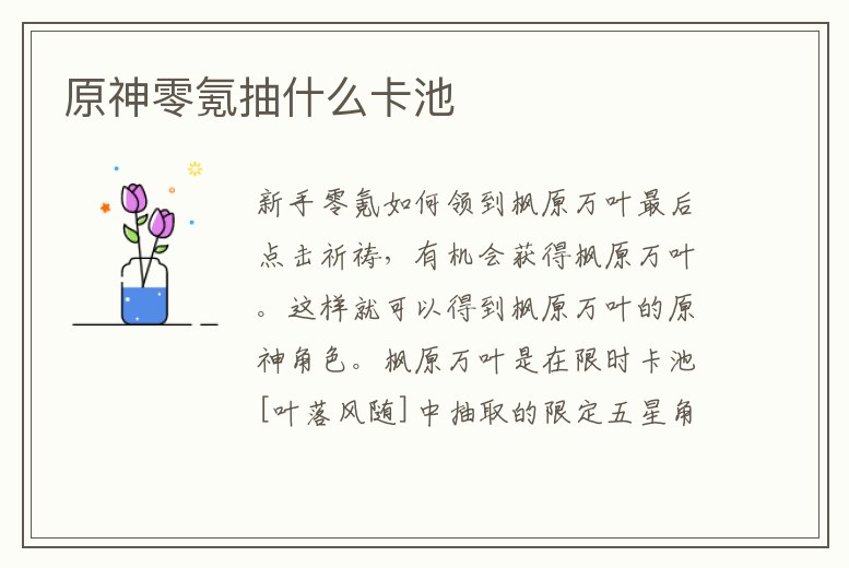最后點擊祈禱,有機會獲得楓原萬葉。這樣就可以得到楓原萬葉的原神角色。楓原萬葉是在限時卡池[葉落風隨]中抽取的限定五星角色,卡池首次在2021/06/29 18:00~2021/7/20 14:59上架,期間手機端按祈愿的星星圖標。