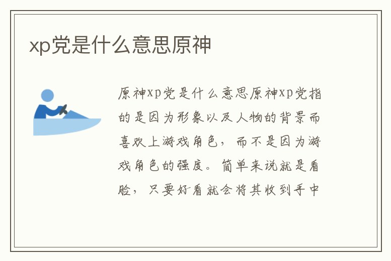 x表示喜歡,P表示偏好,xp黨,原神,指一直用XP系統玩原神,不愿意更新系統的人。原來神xp黨是指喜歡游戲人物是因為人物的形象和背景,而不是因為游戲人物的實力。簡單來說,就是看臉。只要好看,就收。不考慮角色的技能和。