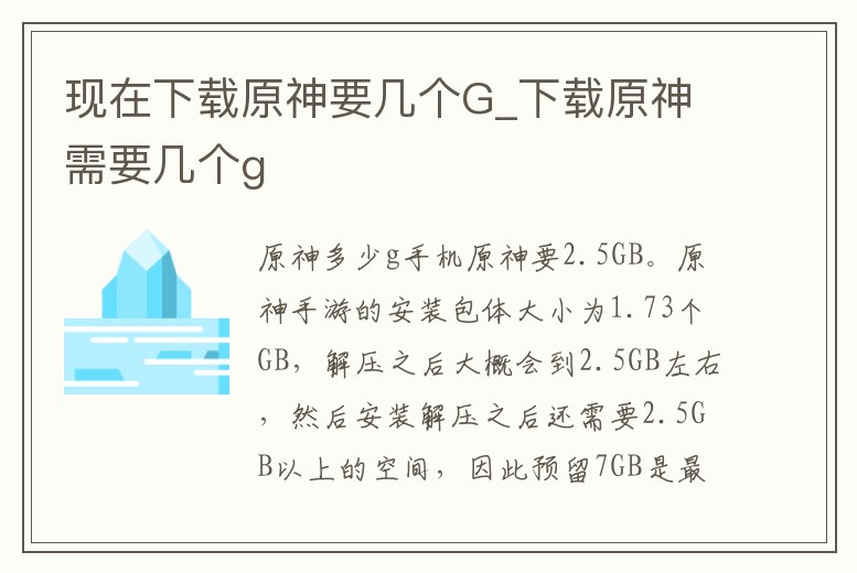 從1.73個GB的安裝包體大小來看,解壓之后大概會到2.5GB左右,然后安裝解壓之后還需要2.5GB以上的空間,因此預留7GB是最低要求。而在安裝游戲之后,進入游戲還需要下載3GB的資源,也就是說不準備8個G基本玩不了。《原神》。