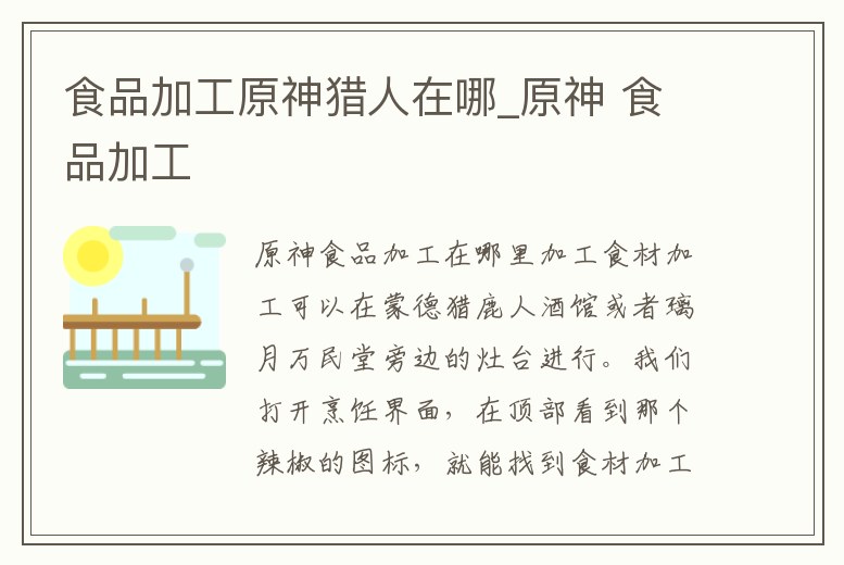 原神游戲里食材加工可以在蒙德獵鹿人酒館或者璃月萬民堂旁邊的灶臺進行,我們打開烹飪界面,在頂部看到那個辣椒的圖標,就能找到食材加工了,還有野外看到篝火的地方都能加工,野外的篝火需要用火元素攻擊一下點火才能使用。食材加工。