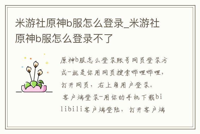 在實(shí)際生活中,很多人可能想了解和弄清楚原神b服怎么登錄賬號(hào)這個(gè)問(wèn)題?那么關(guān)于原神b服怎么登錄賬號(hào)答案我來(lái)給大家詳細(xì)解答下。原神b服怎么登錄賬號(hào) 網(wǎng)頁(yè)登錄方式-就是你用網(wǎng)頁(yè)搜索嗶哩嗶哩,打開(kāi)網(wǎng)頁(yè),右上角用戶登錄。2。