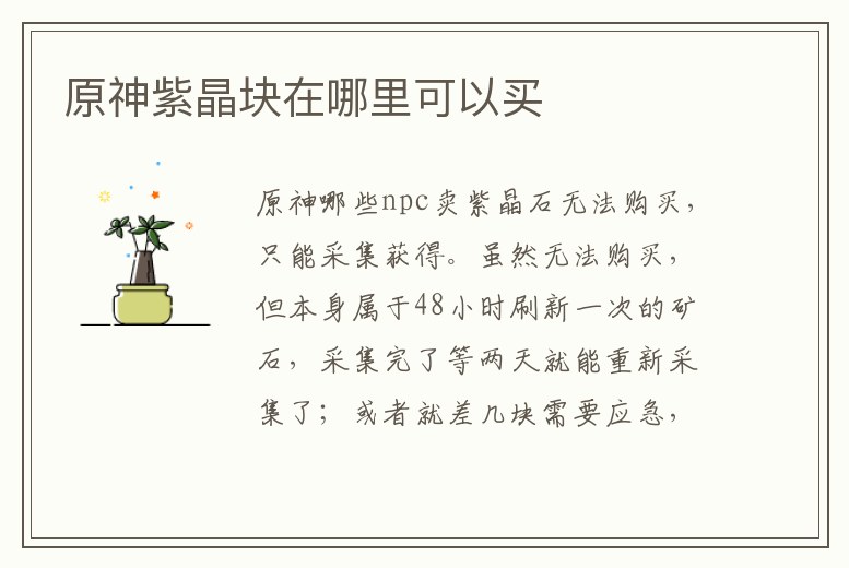 無法購買,只能采集獲得。雖然無法購買,但本身屬于48小時刷新一次的礦石,采集完了等兩天就能重新采集了;或者就差幾塊需要應急,可以去好友那里去采集,畢竟并非所有旅行者都需要紫晶塊來鍛造四星稻妻武器的。原神稻妻紫晶塊采。
