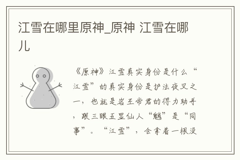 “江雪”的真實身份是護法夜叉之一,也就是巖王帝君的得力助手,跟三眼五顯仙人“魈”是“同事”。“江雪”,會拿著一根沒有魚線的魚竿去河邊釣魚,就像是“姜太公釣魚、愿者上鉤”的做法一樣,看上去很像是一位“世外高。
