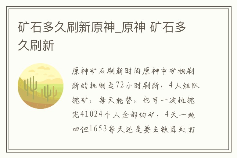 原神中礦物刷新的機制是72小時刷新,4人組隊挖礦,每天輪替,也可一次性挖完41024個人全部的礦,4天一輪回但1653每天還是要去鐵匠處打鐵,水晶礦3天刷新一次,白鐵礦2天刷新一次,鐵礦1天刷新一次。對于挖礦的機制,公測后每。
