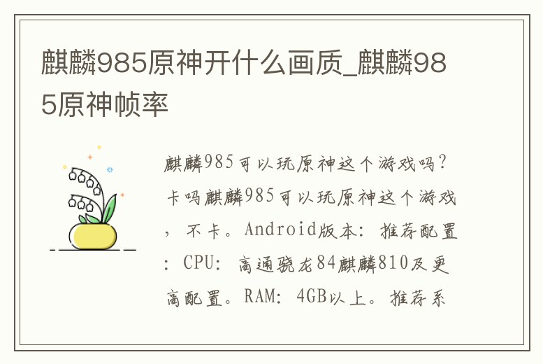 麒麟985可以玩原神這個游戲,不卡。Android版本:推薦配置:CPU:高通驍龍84麒麟810及更高配置。RAM:4GB以上。推薦系統:Android 8.1及以上系統。支持配置:兼容要求:Arm v8a 64位設備。內存:3GB。支持系統:Android 7。