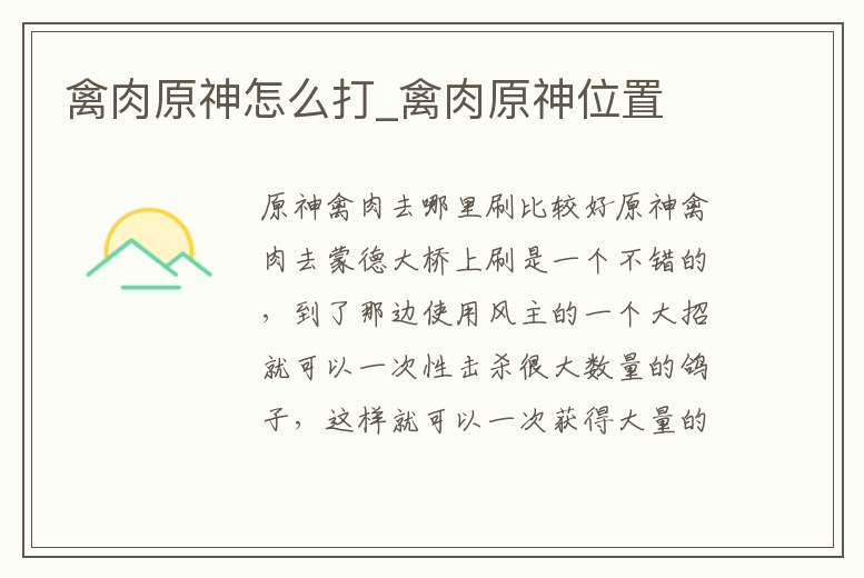 原神禽肉去蒙德大橋上刷是一個不錯的,到了那邊使用風主的一個大招就可以一次性擊殺很大數量的鴿子,這樣就可以一次獲得大量的禽肉了,當然野外的很多地方都可以看到格子,我們直接使用安柏對鴿子進行擊殺就好了,天天釀花雞。