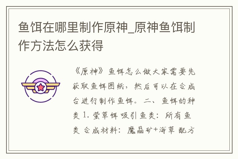 玩家可以在合成臺制作魚餌,其中果釀餌適用魚種為鳉魚類,赤糜餌適用魚種棘魚類,蠕蟲假餌適用魚種為蝶魚類,飛蠅假餌適用魚種為假龍類、炮鲀類。原神魚餌合成材料表:果釀餌=日落果+小麥赤糜餌=血斛+雞腿禽肉蠕蟲假餌。