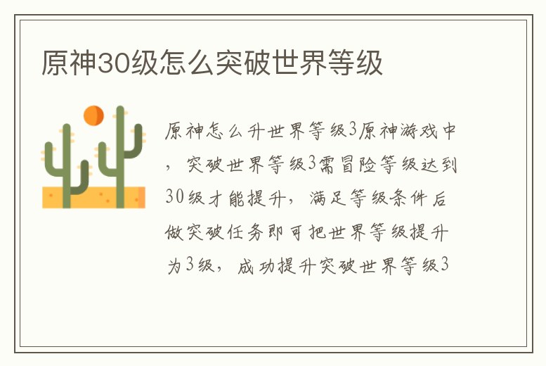 原神游戲中,突破世界等級3需冒險等級達到30級才能提升,滿足等級條件后做突破任務即可把世界等級提升為3級,成功提升突破世界等級3會大大提高游戲的難度。