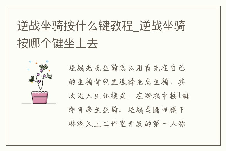 首先在自己的坐騎背包里選擇老虎坐騎。其次進入生化模式。在游戲中按T鍵即可乘坐坐騎。逆戰是騰訊旗下琳瑯天上工作室開發的第一人稱射擊游戲,采用虛幻3引擎開發。