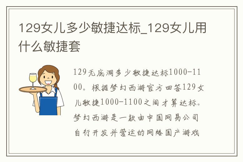 129無底洞多少敏捷達標1000-1100。根據夢幻西游官方回答129女兒敏捷1000-1100之間才算達標。夢幻西游是一款由中國網易公司自行開發并營運的網絡國產游戲。游戲以著名的章回小說西游記故事為