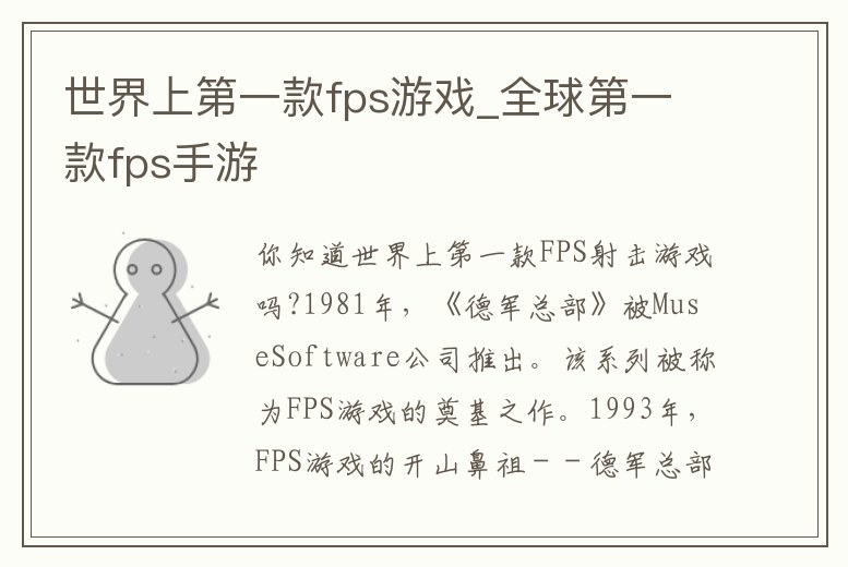 你知道世界上第一款FPS射擊游戲嗎?1981年,《德軍總部》被MuseSoftware公司推出。該系列被稱為FPS游戲的奠基之作。1993年,FPS游戲的開山鼻祖--德軍總部3D一經推出風靡了世界各地。這款游戲開創了一種新的。1、世界上第一款網絡游戲是什么世界上第一款FPS游戲是