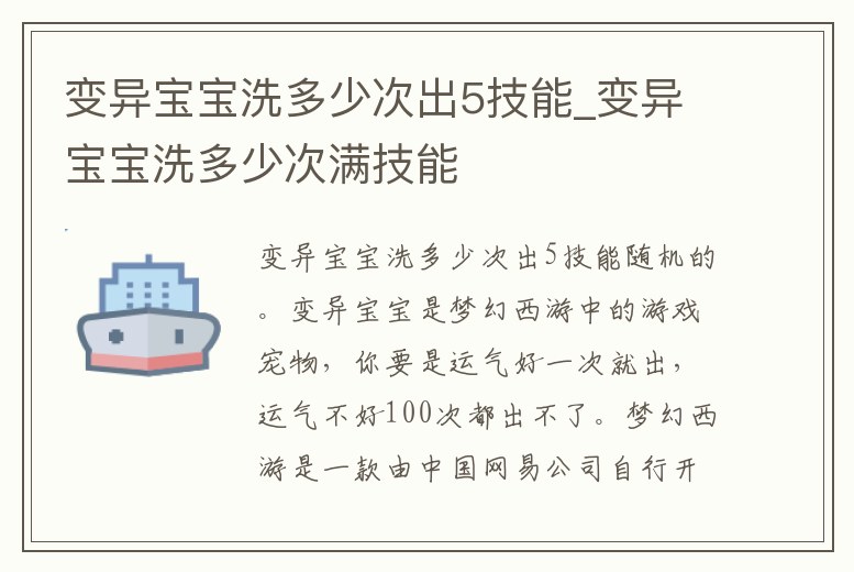 變異寶寶洗多少次出5技能隨機的。變異寶寶是夢幻西游中的游戲寵物,你要是運氣好一次就出,運氣不好100次都出不了。夢幻西游是一款由中國網易公司自行開發并營運的網絡游戲。游戲以著名的章回小說西游記故事為背景,透過Q版的人物,試圖營造出浪漫的網。1、變異吸血鬼寶寶洗多少次出5技能變異吸血鬼寶寶洗多少次出五技能?這個是根據你的運氣的,運氣好