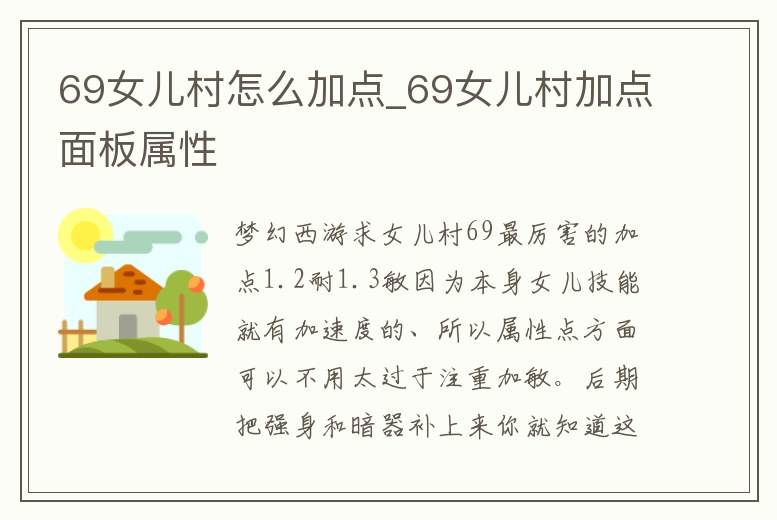 夢幻西游求女兒村69最厲害的加點1.2耐1.3敏因為本身女兒技能就有加速度的、所以屬性點方面可以不用太過于注重加敏。后期把強身和暗器補上來你就知道這樣加的好處了,我也是玩這個門派的、有問題。1、夢幻西游69的女兒村能秒上1000血,怎樣加點3敏1體1耐,暗器120,滿技能,用100的暗器,在找把高傷武器,浮石,奇經八脈整滿,應該就可以上千。2、夢幻西游手游69精女兒村秒690如何達到夢幻西