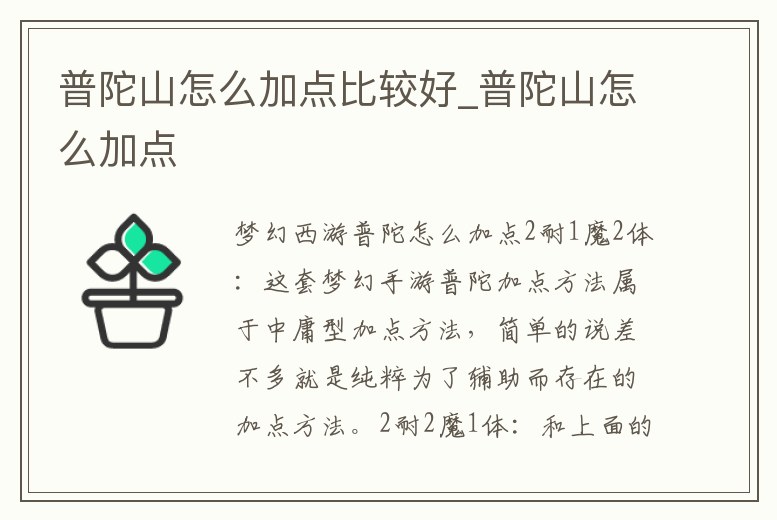 夢幻普陀前期建議加點2體1魔2耐,69之后建議加點3體2耐。輔助主點強身冥思 。
