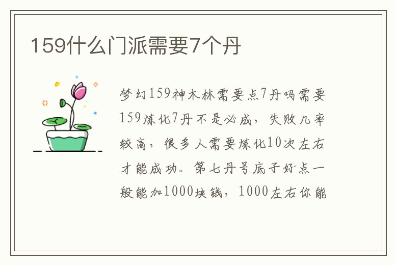 夢幻159神木林需要點7丹嗎需要159煉化7丹不是必成,失敗幾率較高,很多人需要煉化10次左右才能成功。第七丹號底子好點一般能加1000塊錢,1000左右你能點出來就不虧。夢幻西凌波城、神木林、無底洞3個門派循環相克,每個門派都有對應另一個門派。祈福。1、1
