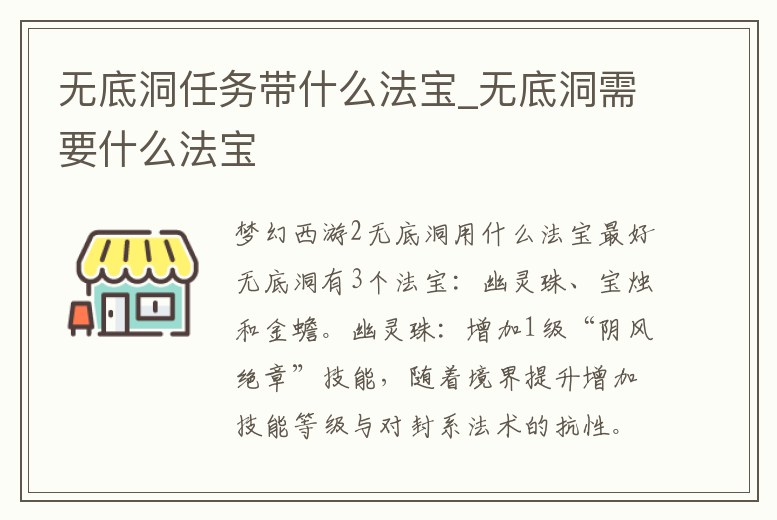 問題三:夢幻西游109無底洞帶什么法寶 個(gè)人感覺,金蟾和寶燭是需要的,另外法寶,看你需要,要是速度不夠就風(fēng)袋,要是速度夠了,帶個(gè)金甲。問題四:夢幻西游129無底洞帶什么法寶 門派法寶啊,PK的話帶風(fēng)帶,也可以帶碧玉。