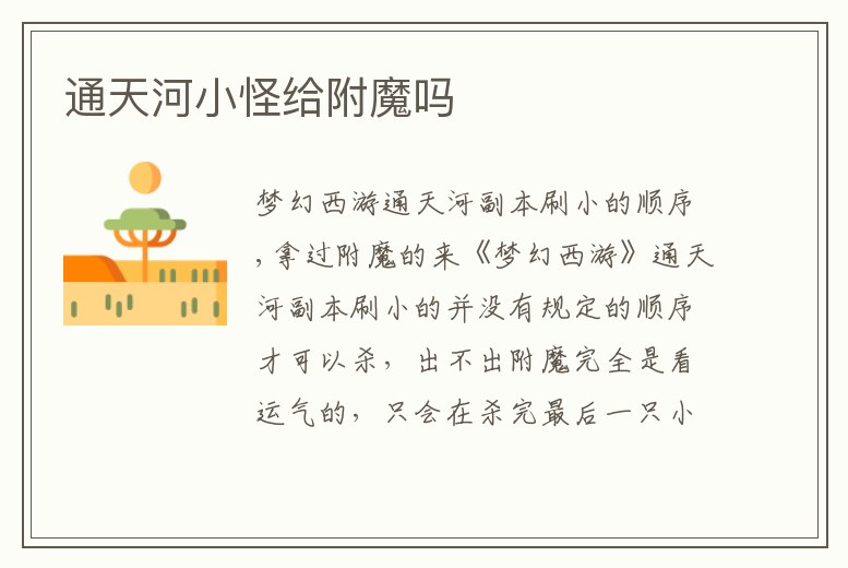 《夢幻西游》通天河副本刷小的并沒有規定的順序才可以殺,出不出附魔完全是看運氣的,只會在殺完最后一只小怪時才有幾率掉落,并不是百分百得的。通天河副本殺到最后,兩隊人馬分別進入了戰斗,一隊去搗毀妖怪的五臟廟。