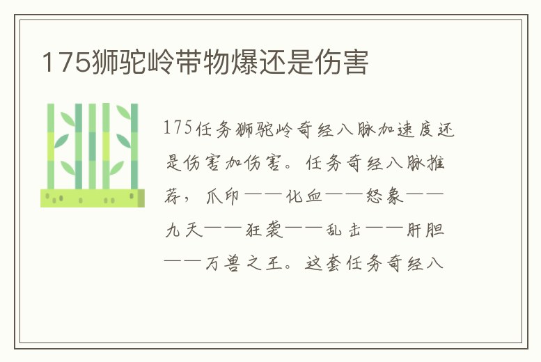175任務獅駝嶺奇經八脈加速度還是傷害加傷害。任務奇經八脈推薦,爪印——化血——怒象——九天——狂襲——亂擊——肝膽——萬獸之王。這套任務奇經八脈點法,很好的突出了獅駝嶺的輸出,鷹擊傷害加強,連環擊殺主也能不取消變身,休息一回合后可以繼續使用。1、175獅駝嶺自帶暴擊嗎175獅駝嶺不自帶暴擊。需要出相應的裝備才能出暴擊,物理暴擊出裝:暴擊頭鞋腰帶衣服武器項鏈。2、夢幻西游175獅駝嶺飛環怪能全