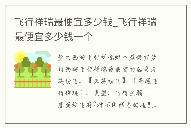 夢幻西游飛行祥瑞最便宜的就是落英紛飛。【落英紛飛】 (普通飛行祥瑞):類型:飛行坐騎——落英紛飛有7種不同顏色的造型。獲得:≥30級可找桃源仙子(寶象國57,25或仙緣洞天61,126)購買或者他人贈送祥瑞。價格:1200點仙。
