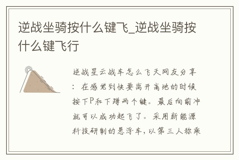 網友分享:在感覺到快要離開高地的時候按下P和下蹲兩個鍵。最后向前沖就可以成功起飛了。采用新能源科技研制的懸浮車,以第三人稱乘坐戰車加速騎行。逆戰星云戰車卡飛天的話,主要是切換頁面,你騎上戰車的瞬間,en飛天劍,然后把頁面切。