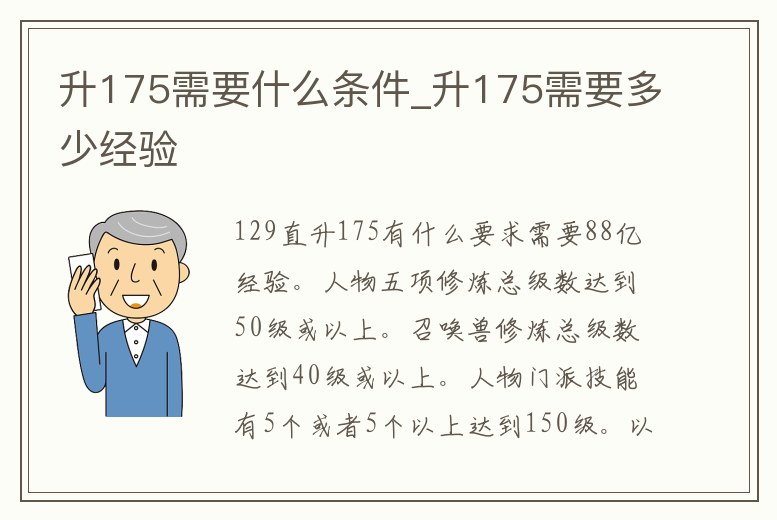 需要88億經驗。人物五項修煉總級數達到50級或以上。召喚獸修煉總級數達到40級或以上。人物門派技能有5個或者5個以上達到150級。以上是129直升175升級的要求。