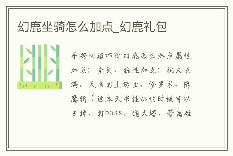 加點:4敏(抗點抗冰凍次遺忘)妖石推薦:速度,防御,氣血 天書推薦:仙風,云體,盡忠 玩家可根據自身情況進行點化、幻化(速度1-3次)【體寵培養推薦——幻鹿】幻鹿擁有坐騎中最高的氣血成長,放眼所有寵物。