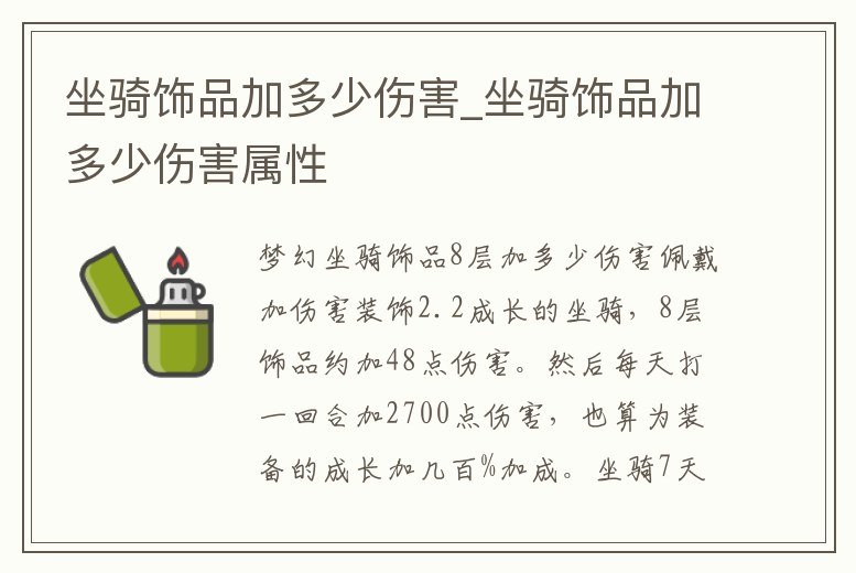 佩戴加傷害裝飾2.2成長的坐騎,8層飾品約加48點傷害。【坐騎裝飾】坐騎飾品有5種屬性加成:加傷害、氣血、防御、速度、靈力。佩戴后,該坐騎所統御的召喚獸戰力得到加強。影響因素:加成效果受坐騎裝飾境界、坐騎成長、坐騎飽食。