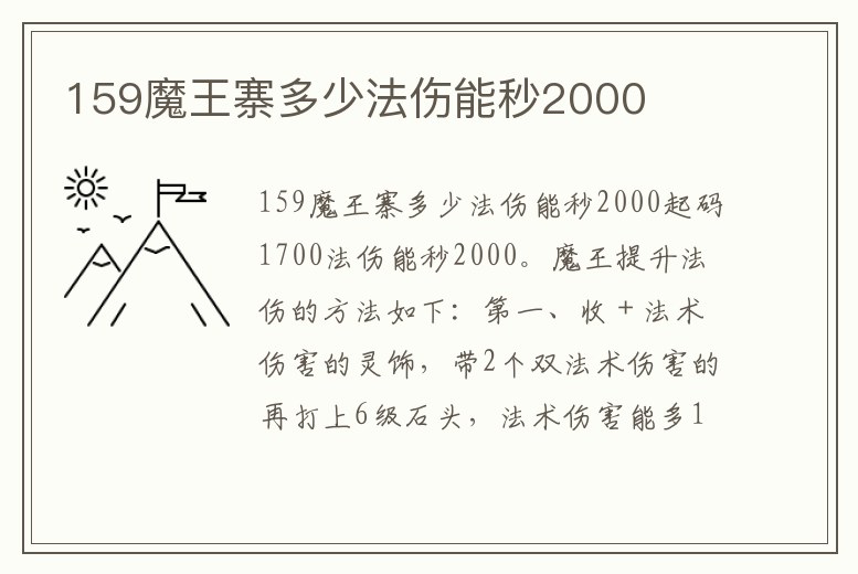 起碼1700法傷能秒2000。魔王提升法傷的方法如下:第一、收+法術(shù)傷害的靈飾,帶2個雙法術(shù)傷害的再打上6級石頭,法術(shù)傷害能多100多。第二、收高傷害武器,優(yōu)先選擇400初傷雙加體魔的武器,打8段以上太陽石。第三、弄全魔。