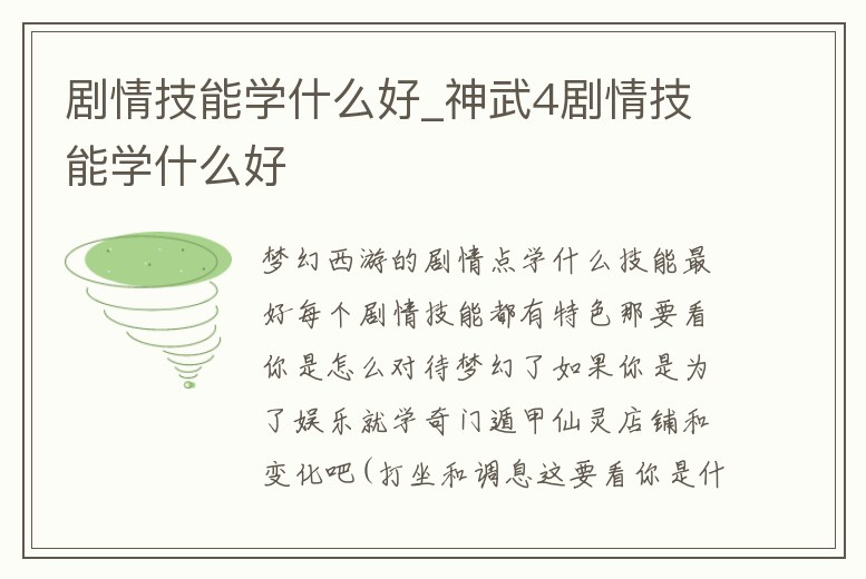 問題一:神武學什么劇情技能 1.5級變身肯定需要的,長期玩參加活動幫戰之類的,變身是必備的!這個需要20點劇情技能點。2.丹元濟會,服用藥品可以多加點,PK挺實用的。這個可以看情況要不要學,你可以把想要學的學滿了。
