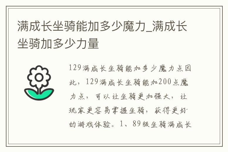 因此,129滿成長坐騎能加200點魔力點,可以讓坐騎更加強大,讓玩家更容易掌握坐騎,獲得更好的游戲體驗。