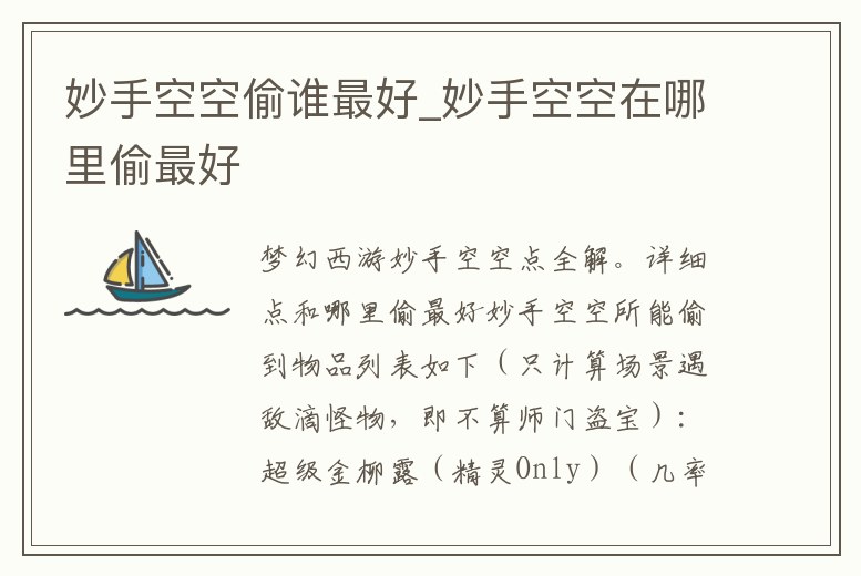妙手空空所能偷到物品列表如下(只計算場景遇敵滴怪物,即不算師門盜寶):超級金柳露(精靈Only)(幾率較小);金柳露(精靈Only)(30%左右幾率吧 比較常見);怪物卡片(偷什么樣的怪物,就有什么樣的怪物卡片。小強為。